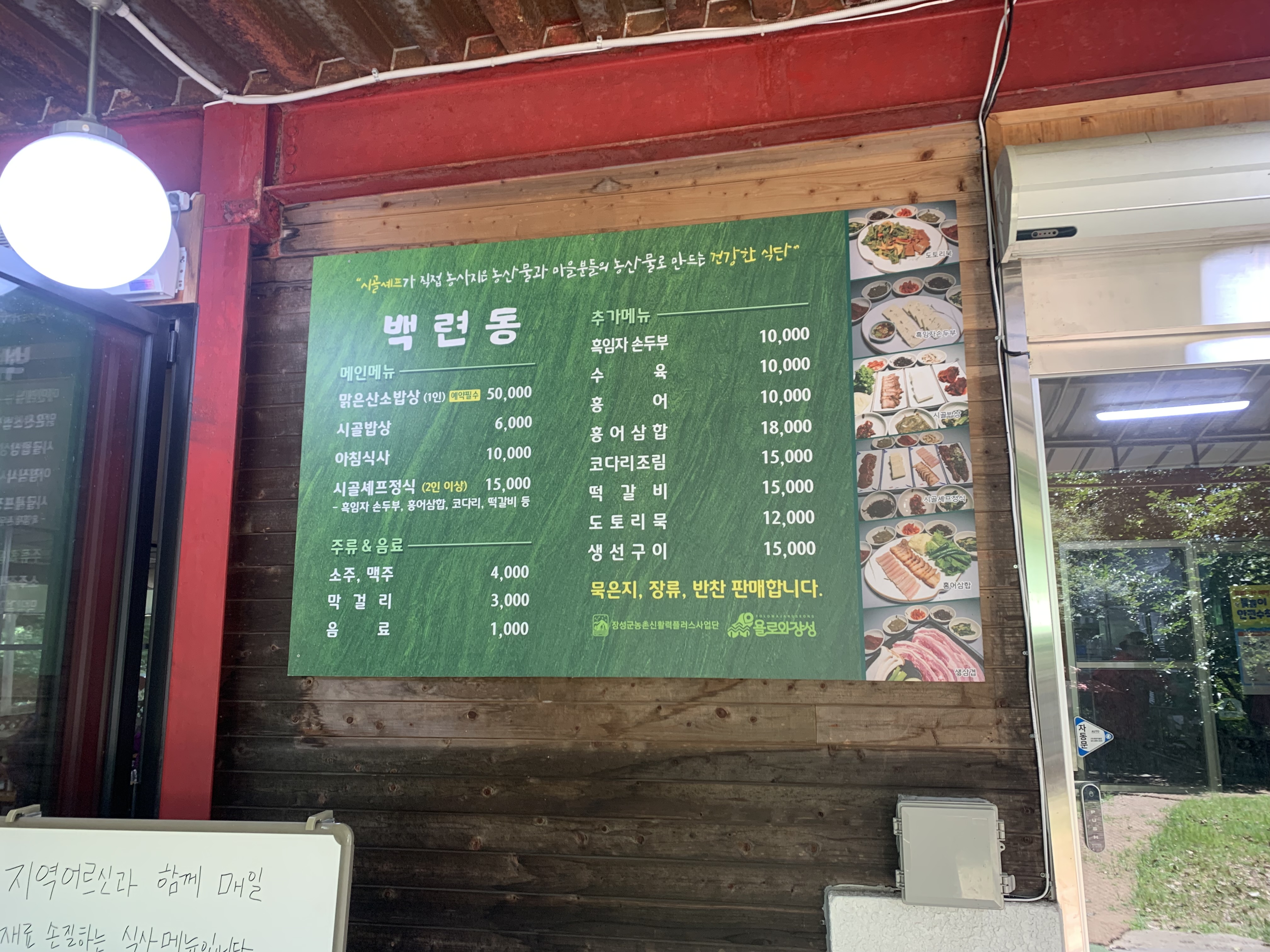 게시판에 적힌 내용을 보니, 이곳에서 사용하는 쌀, 채소, 과일 등 대부분의 식재료가 장성 지역의 농가에서 직접 공급받는 것들이었습니다. 로컬푸드의 진정한 의미를 실천하고 있는 셈이죠.