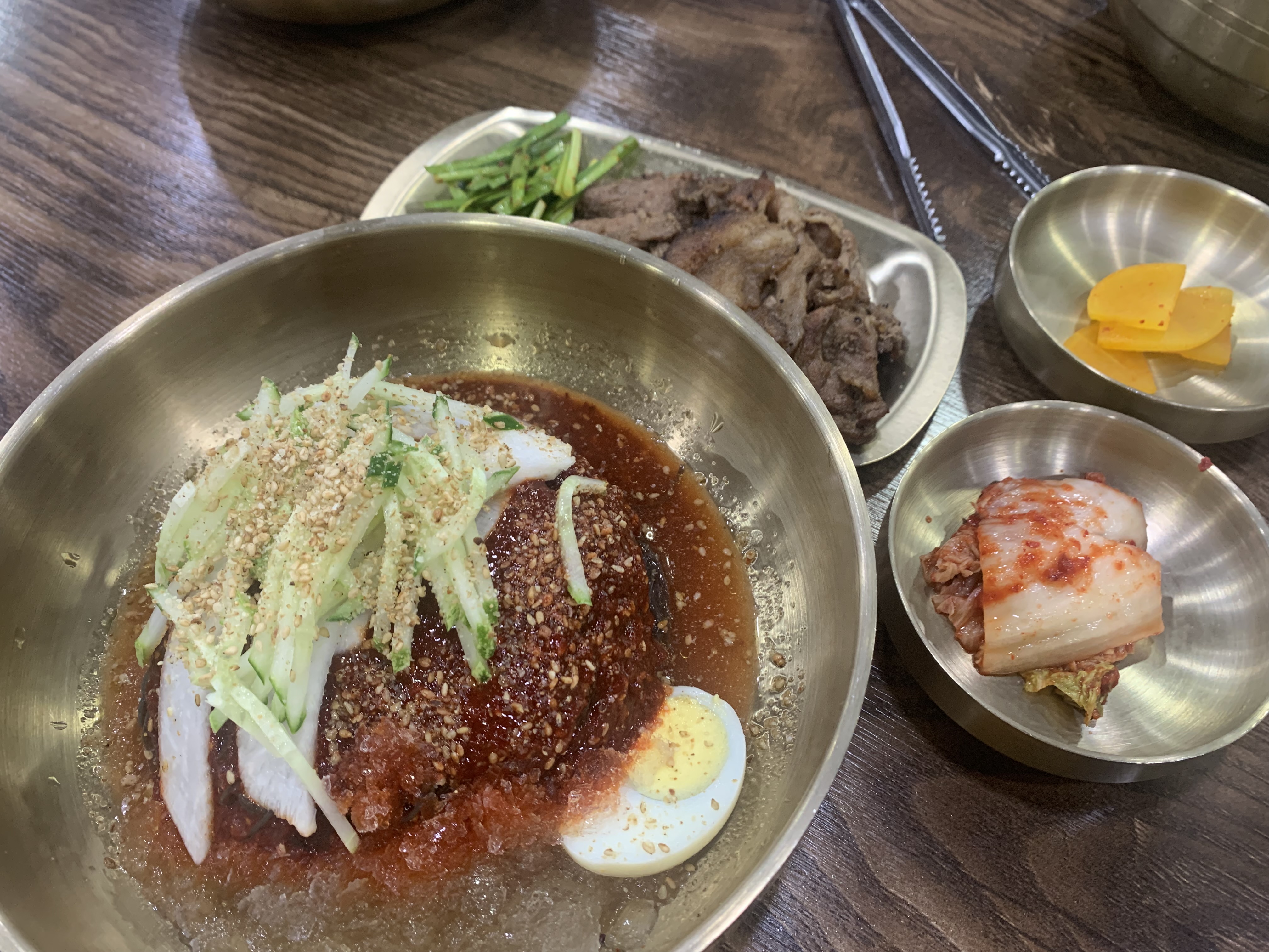 비빔냉면과 왕만두를 번갈아 가며 먹는 맛이 정말 일품이었습니다. 매콤하고 차가운 비빔냉면을 한 젓가락 먹고, 고소하고 뜨끈한 왕만두를 한 입 베어 물면 입안에서 온도의 대비와 맛의 조화가 폭발했어요.