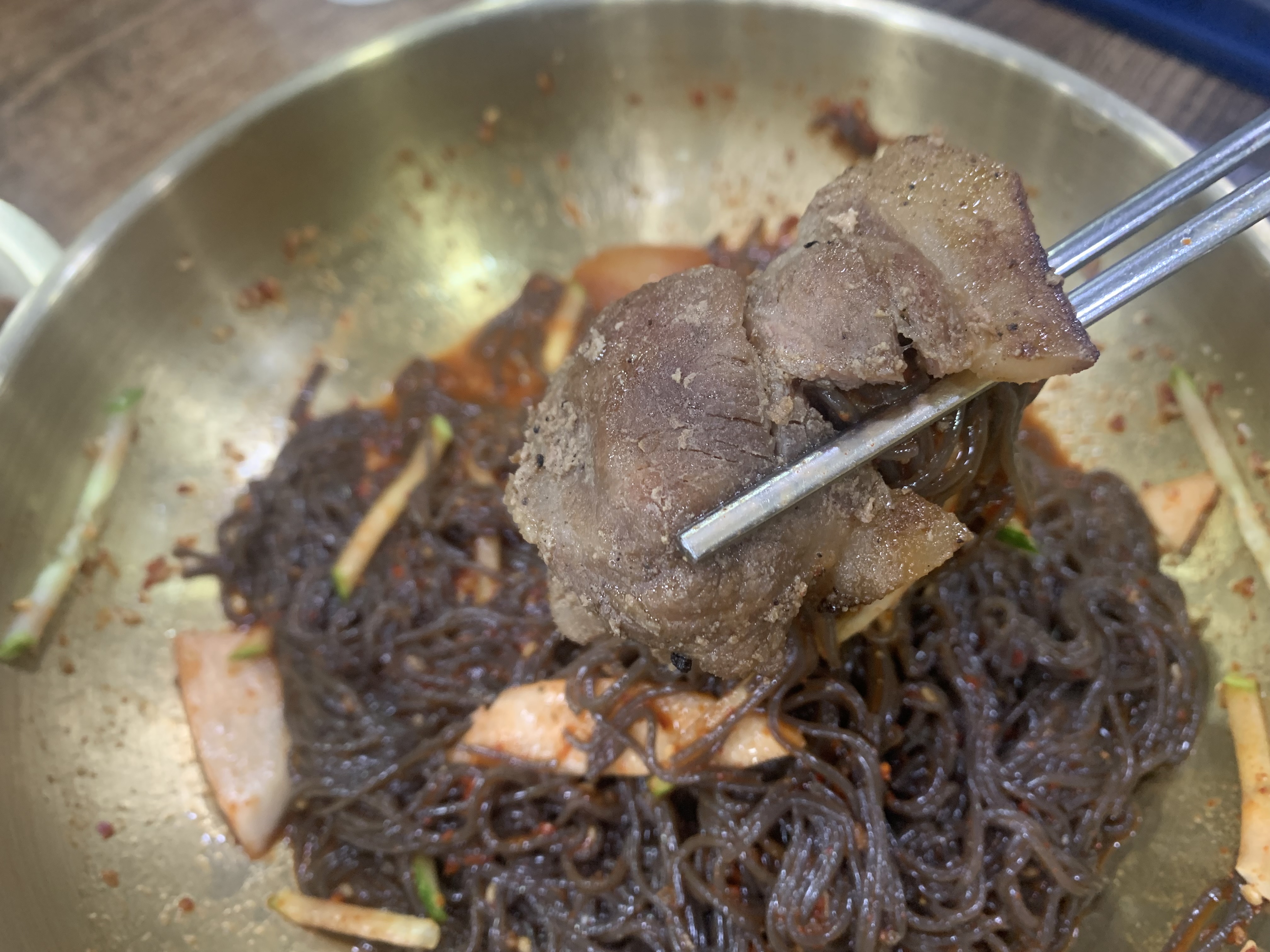 간장베이스로 구워서 나오는데, 약간 달달하면서도 짭조름한 맛이 비빔냉면과 함께 먹으면 정말 맛있더라고요.